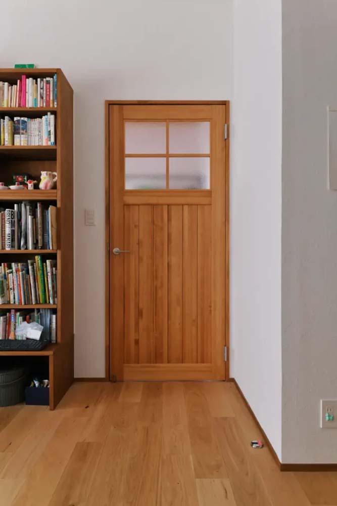 年月を重ねた深みがある上質なヴィンテージマンションに呼応するよう、内装には自然素材をたっぷり使用。メインの床にオークの挽板を採用し、漆喰やウエスタンレッドシダーパネルを要所要所に散りばめました。本棚はラワン材+自然派塗料・春風のコルク色のオイル塗装に。存在感のあるキッチンや部屋のポイントになる建具だけでなく、壁と床の境目に付ける巾木までも無垢材で仕上げています。