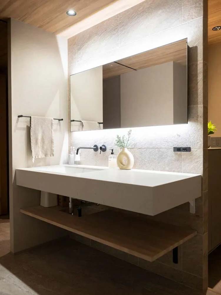 第一条件だったサウナは、水風呂と行き来できるよう、浴室のすぐ隣に設置。その手前のオープンな洗面台は、家族が並んで使える広さと玄関からのスムーズな動線を両立しています。