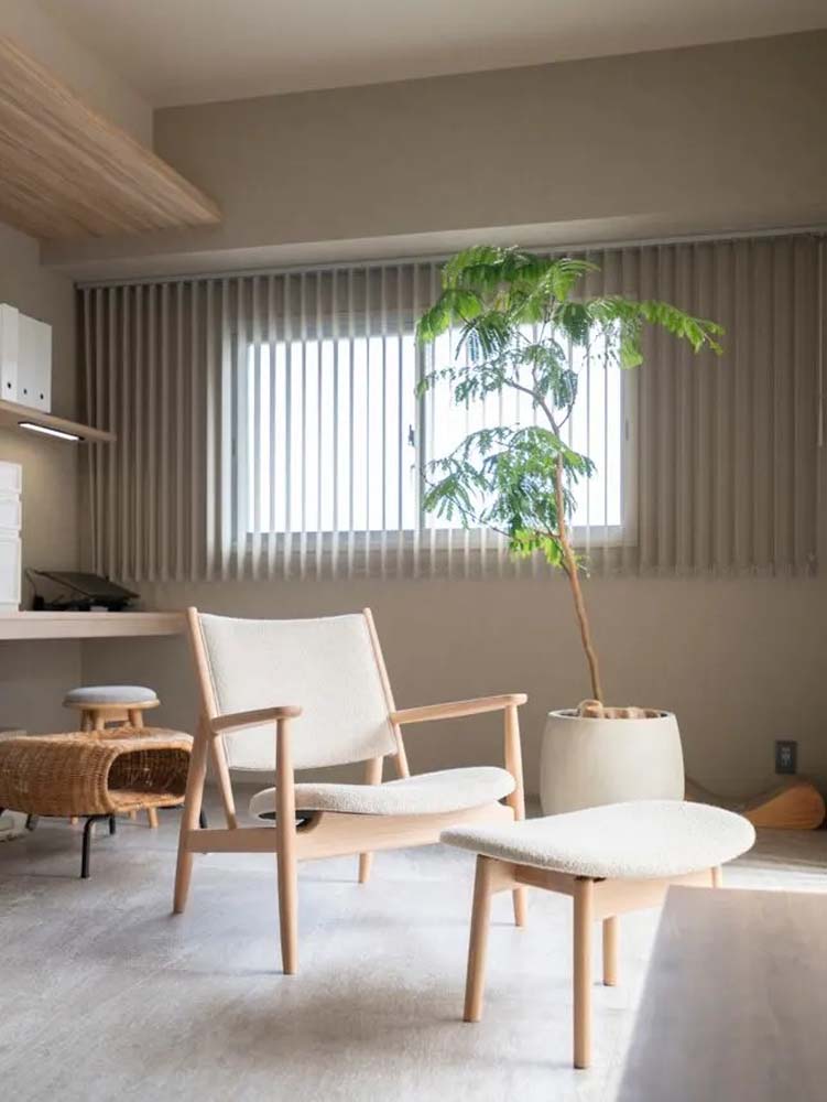 グレーを基調にしたシンプルなインテリア。あえて余白を残すことで、デザイン性のある上品な家具が映えています。天井は一部板張りにして空間に変化をもたせました。
