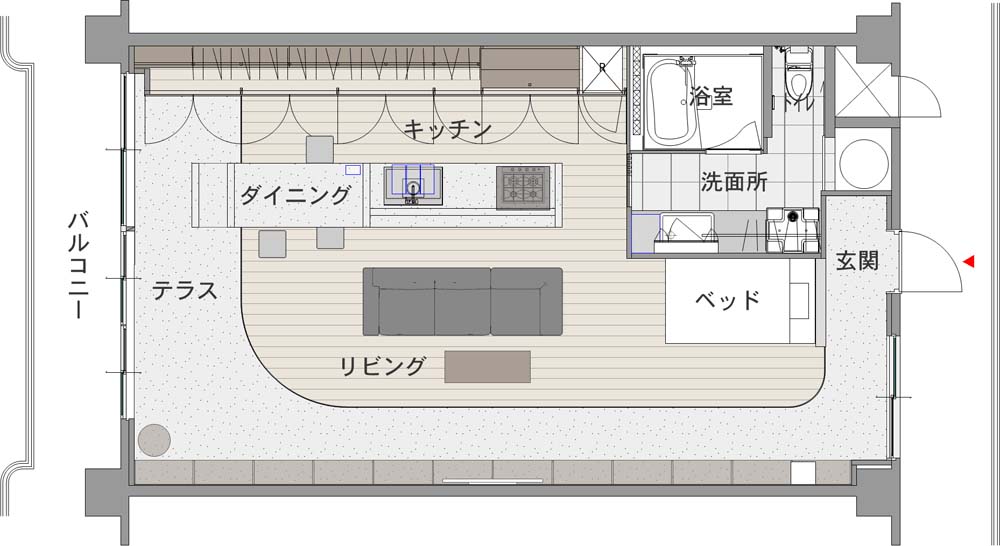 細かく仕切られていた既存の間取りは、壁を取り払ってオープンなワンルームに変更。部屋の中央には大きなキッチンを配して、リビング、ベッドコーナーと連続させました。