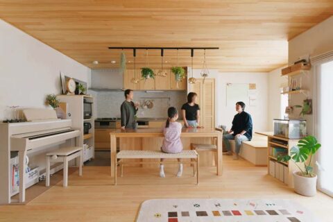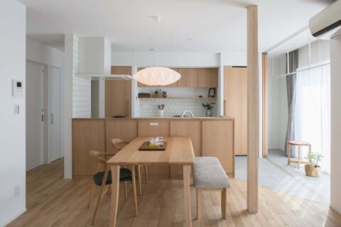 母と一緒にくらすため、全面的に改修を施した木造平屋の実家。和室や廊下をなくし、キッチンを移動することで、家族団らんのリビングを中心にした間取りに再構築しています。キッチンの横のインナーテラスは、洗濯物の室内干しや園芸に便利な場所。インナーテラス~キッチン~バスルームを一直線につなげて、家事が円滑に流れる動線に。
