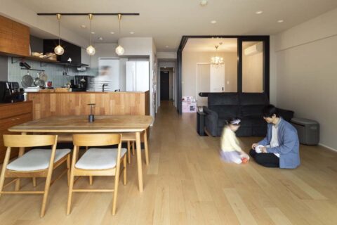 ミニマルな子ども部屋を確保した65㎡のマンションリノベーション。既存の和室と押入れを2分割することで、大きな間取り変更せずに実現しました。窓はないものの、間仕切壁の上部を開放してエアコンを共有。リビング側の室内窓によって自然の風も通り抜けるようになっています。キッチンは、パントリーの床を上げて排水経路を確保し、憧れのオープンタイプの対面式に。