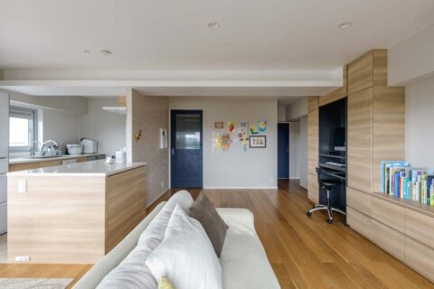 築古ならではの低い天井と梁を、壁の移動や間接照明で目立たないようにしたリノベーション。キッチンの仕切りも撤去し、圧迫感のない明るい住まいをつくり上げています。リビングは、壁収納に夫のワークスペースを組み込み、家族それぞれが別のことをしていても時間を共有する空間に。ワンルームの子ども部屋は、将来分割する準備もしています。